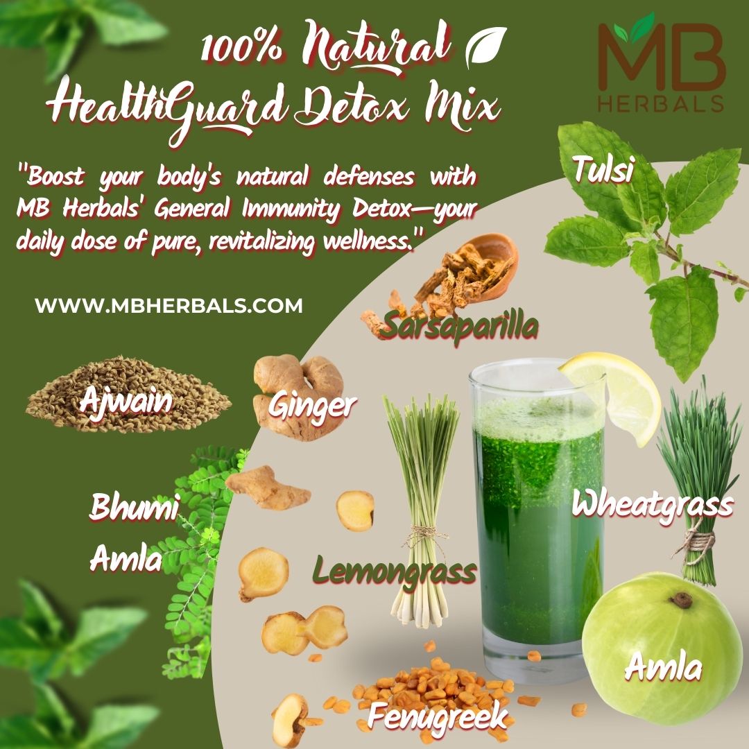 Ingredients: Detox powder mix (with ingredients : Amla, Tulsi, Sarsaparilla, Ginger, Ajwain, Bhumiamla, Lemongrass, Wheatgrass, Fenugreek).