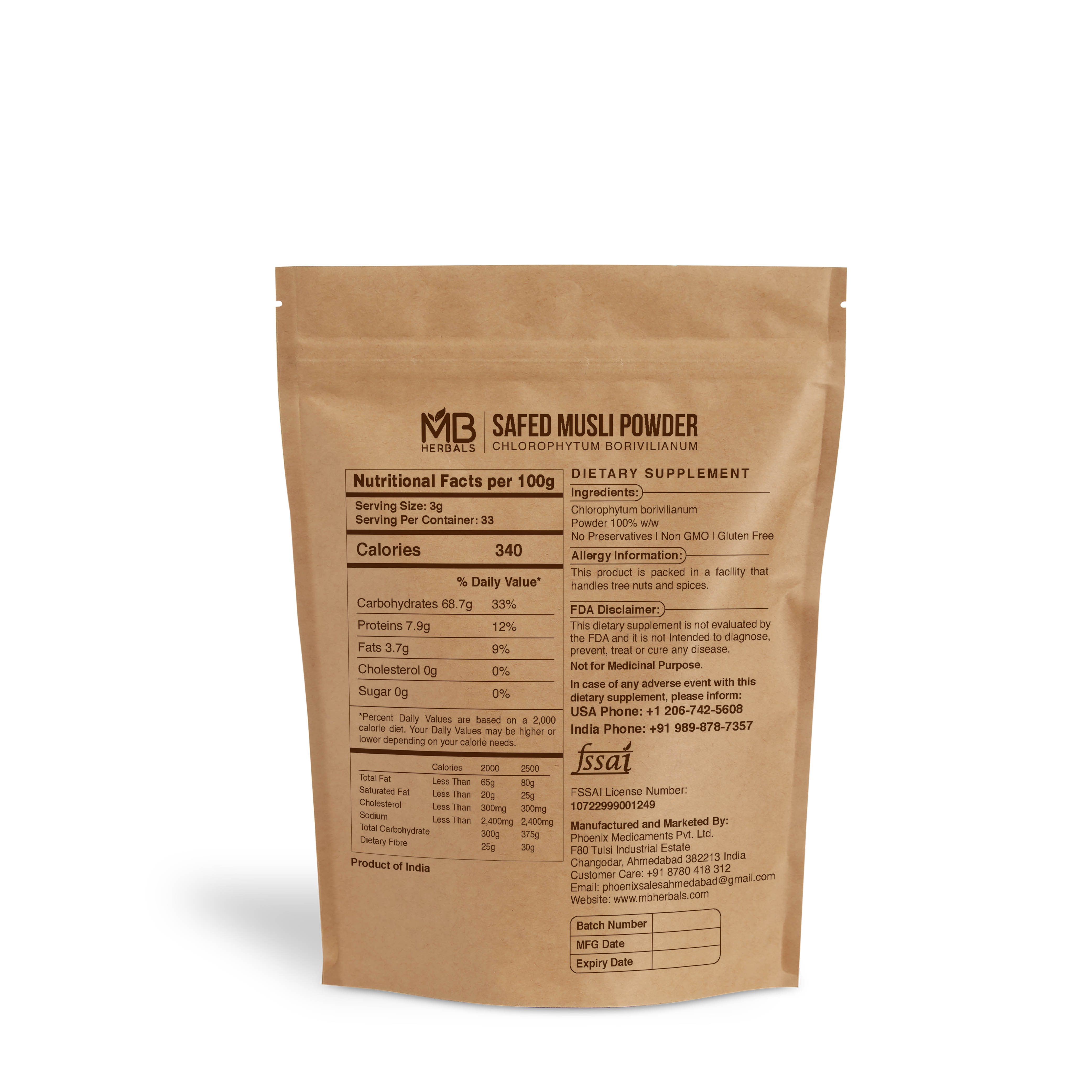 Pure safed musli powder processed in a very reputed, GMP and FDA registered ayurvedic company. Musli roots are sourced from tribal farmers of Madhya Pradesh, India